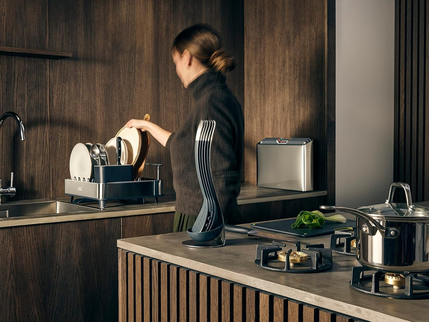 - Paletas para drenar que no rayan y soporte para tabla de cortar.