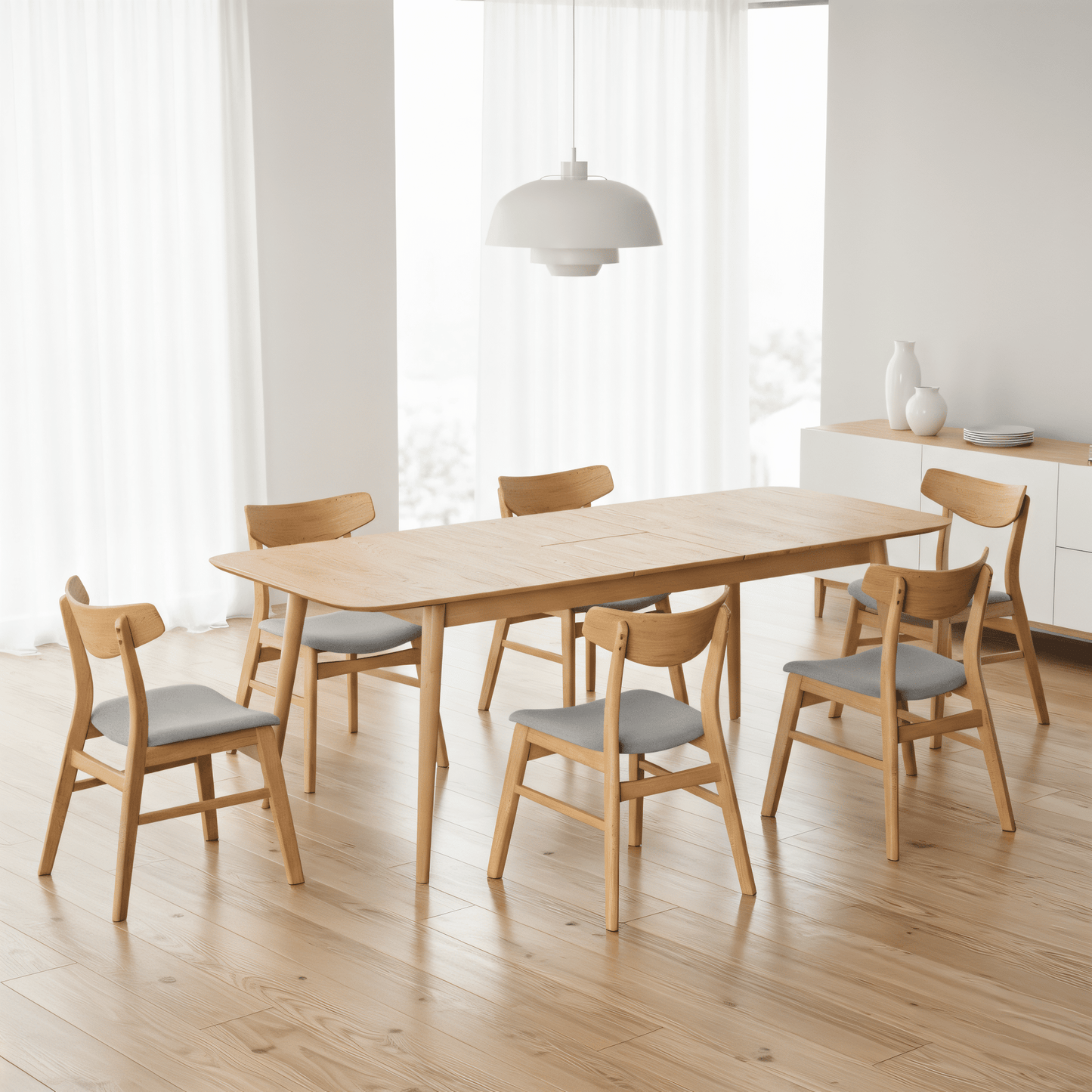 Renueva tu comedor con el elegante set Montreal de Midtown Concept, compuesto por una Mesa Extensible y 6 Sillas a juego. La mesa, con su diseño moderno y su tapa de acabado natural, se convierte en el centro perfecto para comidas y reuniones, aportando calidez y sofisticación a cualquier espacio.
