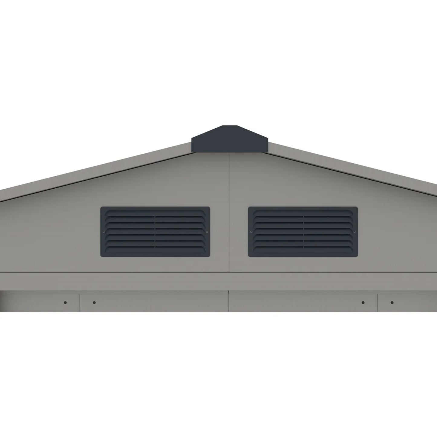 El tejado inclinado evita la acumulación de agua de lluvia, y las rejillas de ventilación integradas mantienen sus pertenencias secas y bien ventiladas.