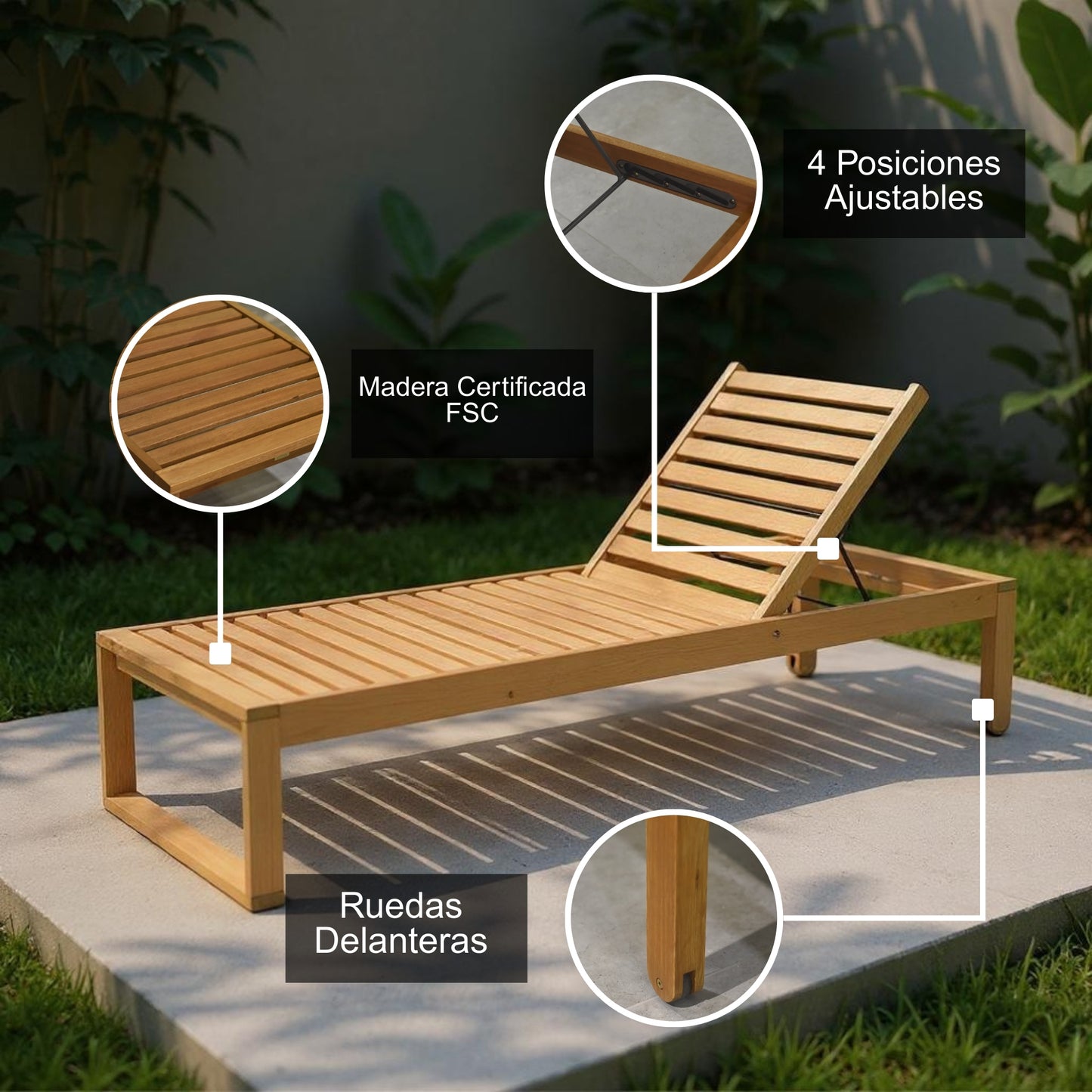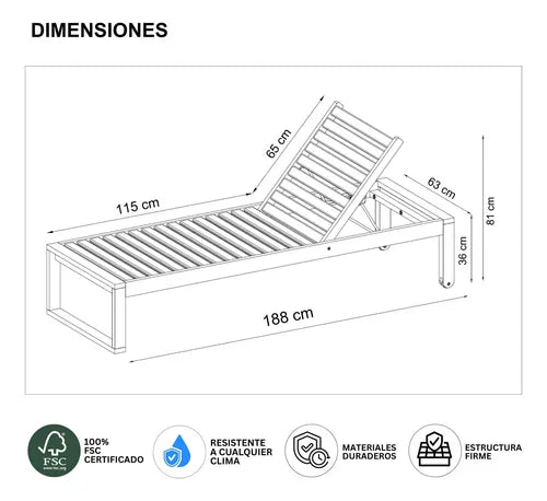 Fabricado con materiales resistentes y duraderos, está pensado para soportar el uso diario al aire libre. Su respaldo reclinable en múltiples posiciones permite que encuentres siempre la postura ideal, ya sea para leer, tomar una siesta o simplemente relajarte. Además, cuenta con dos ruedas traseras que facilitan su traslado sin esfuerzo.