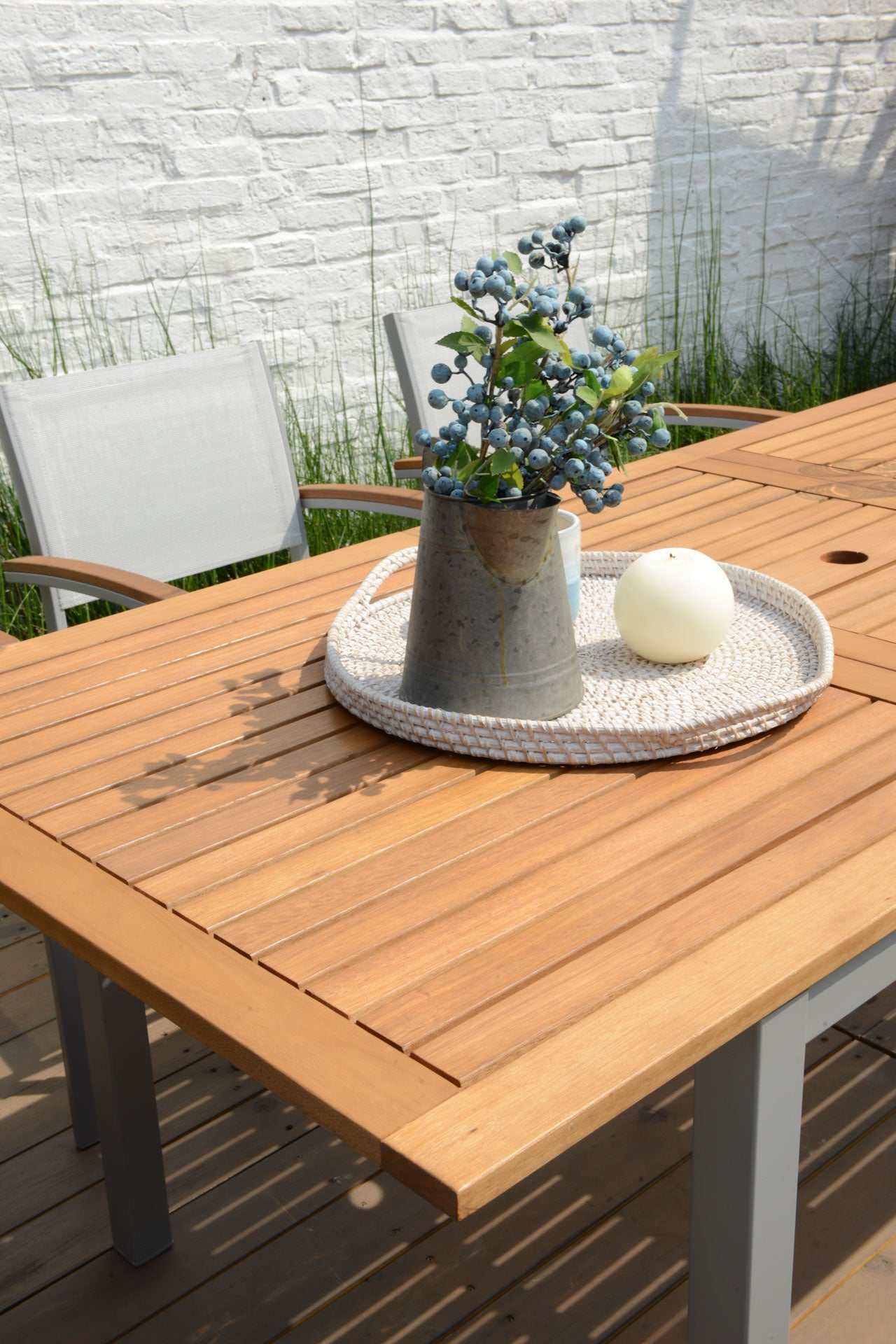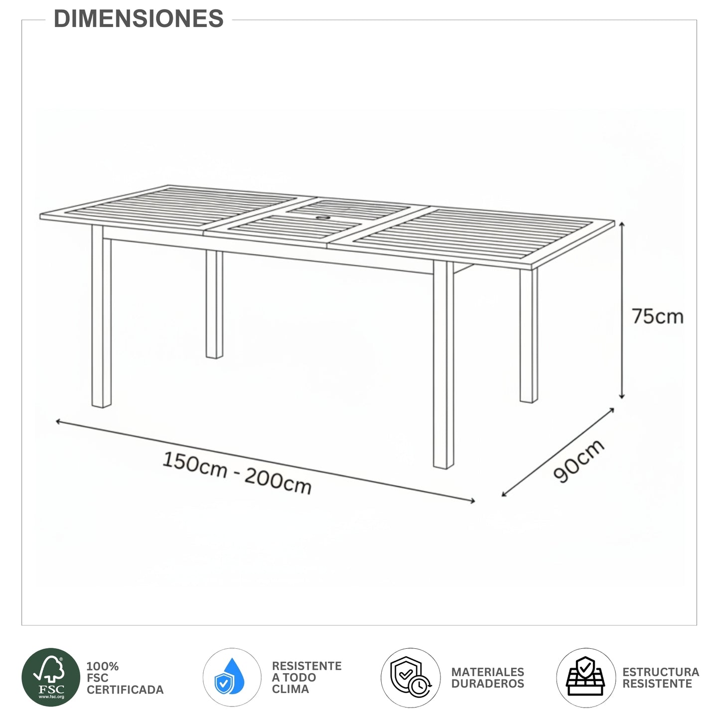 Su mecanismo extensible permite ampliar la superficie de 150 a 200 cm con facilidad, brindando espacio cómodo para hasta 8 personas. Incluye un agujero central para sombrilla, perfecto para crear sombra durante almuerzos o reuniones en días soleados.