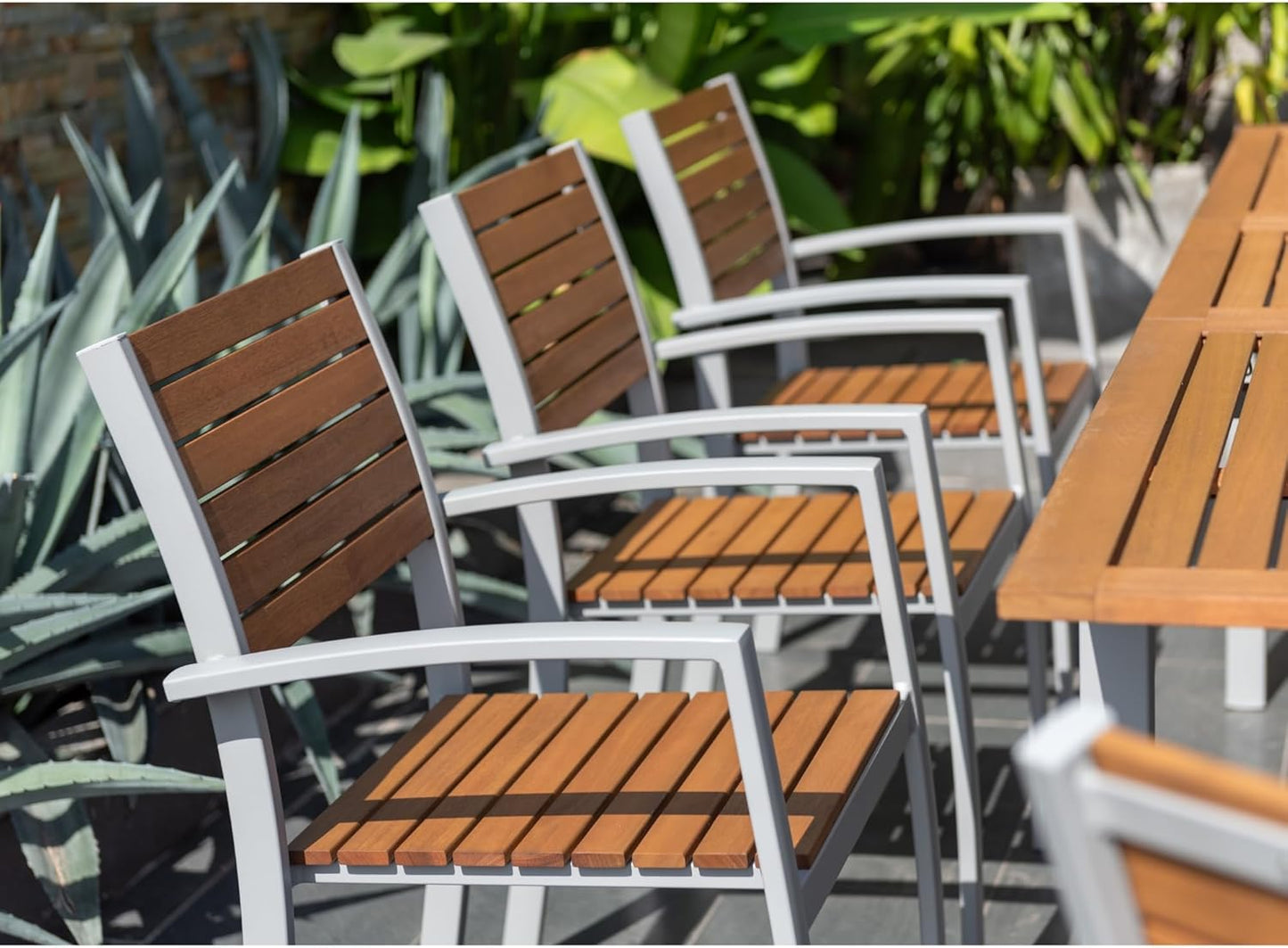 Las sillas que acompañan el conjunto tienen estructura de aluminio y asiento y respaldo en madera de eucalipto con certificación FSC. Este diseño combina ligereza, resistencia y confort, siendo ideal para exteriores. Además de ser visualmente atractivas, estas sillas aportan un toque cálido y natural al ambiente, integrándose con armonía a la estética de la mesa.
