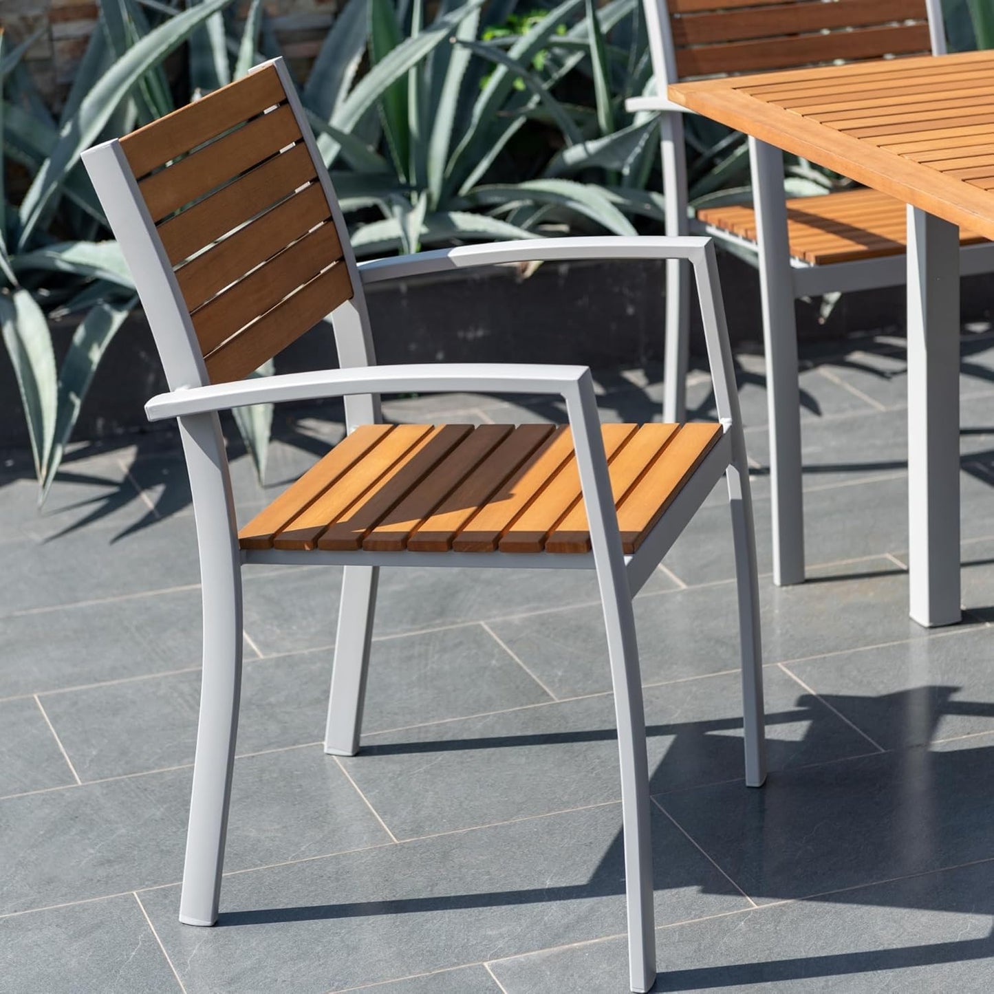 Las sillas que lo acompañan combinan una estructura de aluminio con asiento y respaldo de madera de eucalipto con certificación FSC. Son ligeras, cómodas y están diseñadas para resistir el uso diario en exteriores. La fusión de aluminio y madera les da un estilo contemporáneo sin perder el toque cálido y natural, lo que las convierte en una opción versátil y funcional para todo tipo de espacios.